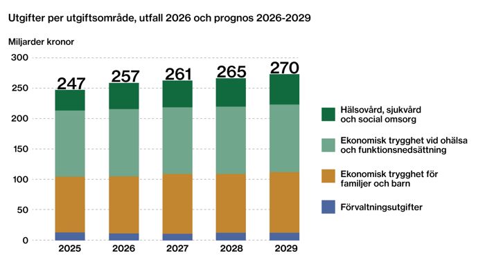 Totalt beräknas utgifterna för socialförsäkringen för år 2026 bli 257 miljarder, en ökning med 10 miljarder kronor jämfört med föregående år. De beräknade utgifterna står för drygt 17 procent av de 1 502 miljarder som utgör statens totala budgeterade utgifter för året.