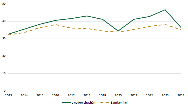År 2025 blev 37 procent av alla ungdomshushåll som får bostadsbidrag återbetalningsskyldiga med i genomsnitt 5 300 kronor. Bland barnfamiljer var motsvarande andel 35 procent, vilket i genomsnitt motsvarar 8 500 kronor. Inkomstgränserna för ungdomshushåll är lägre än för barnfamiljer och därför är det lättare för ungdomshushåll att slå i taket och där med bli återbetalningsskyldiga.