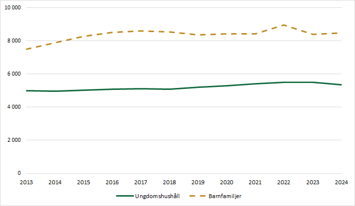 År 2018 fick totalt 220 900 hushåll bostadsbidrag utbetalt, medan motsvarande siffra för 2025 var det 137 200. Av de hushåll som fick bostadsbidrag 2025 var 83 procent barnfamiljer och 17 procent ungdomshushåll.